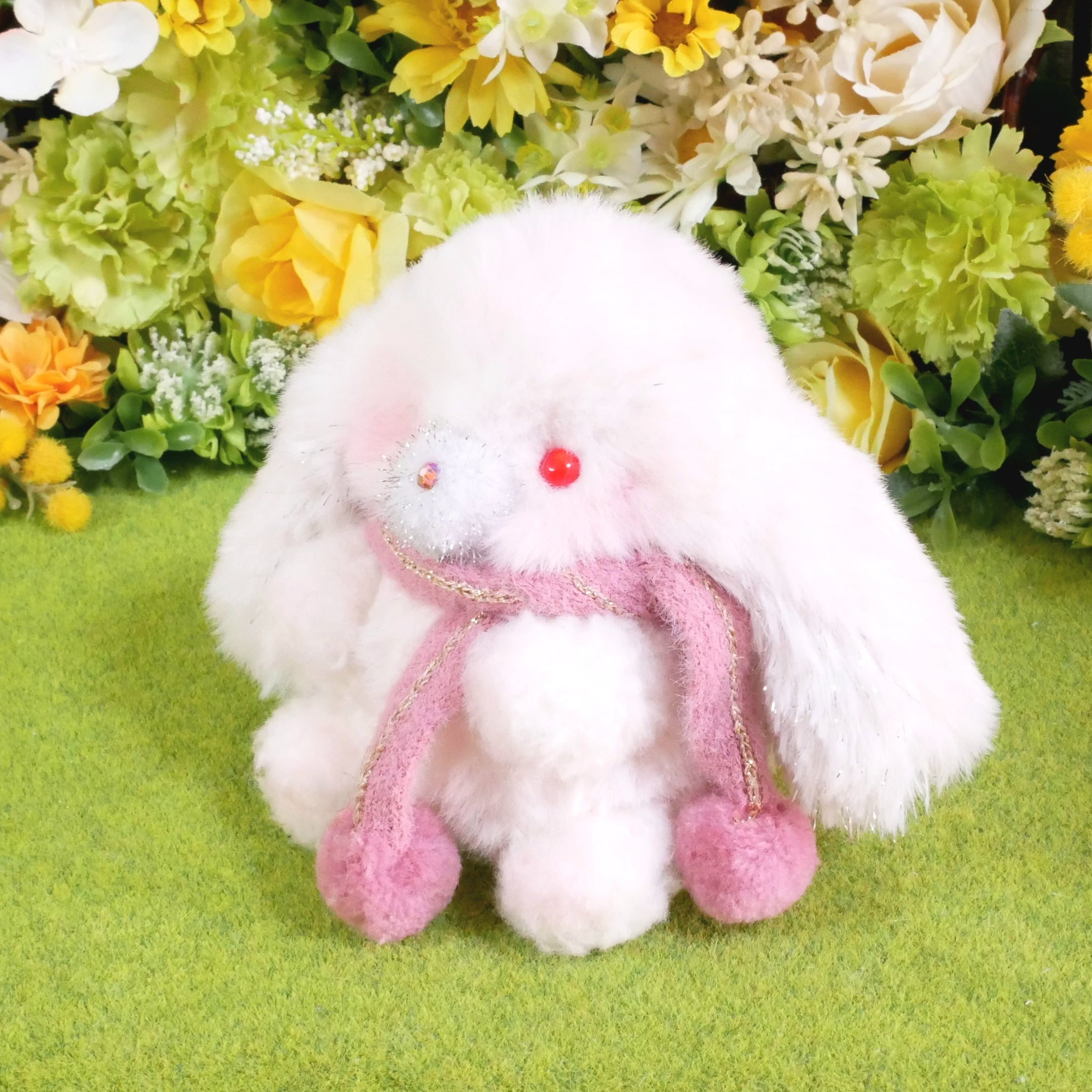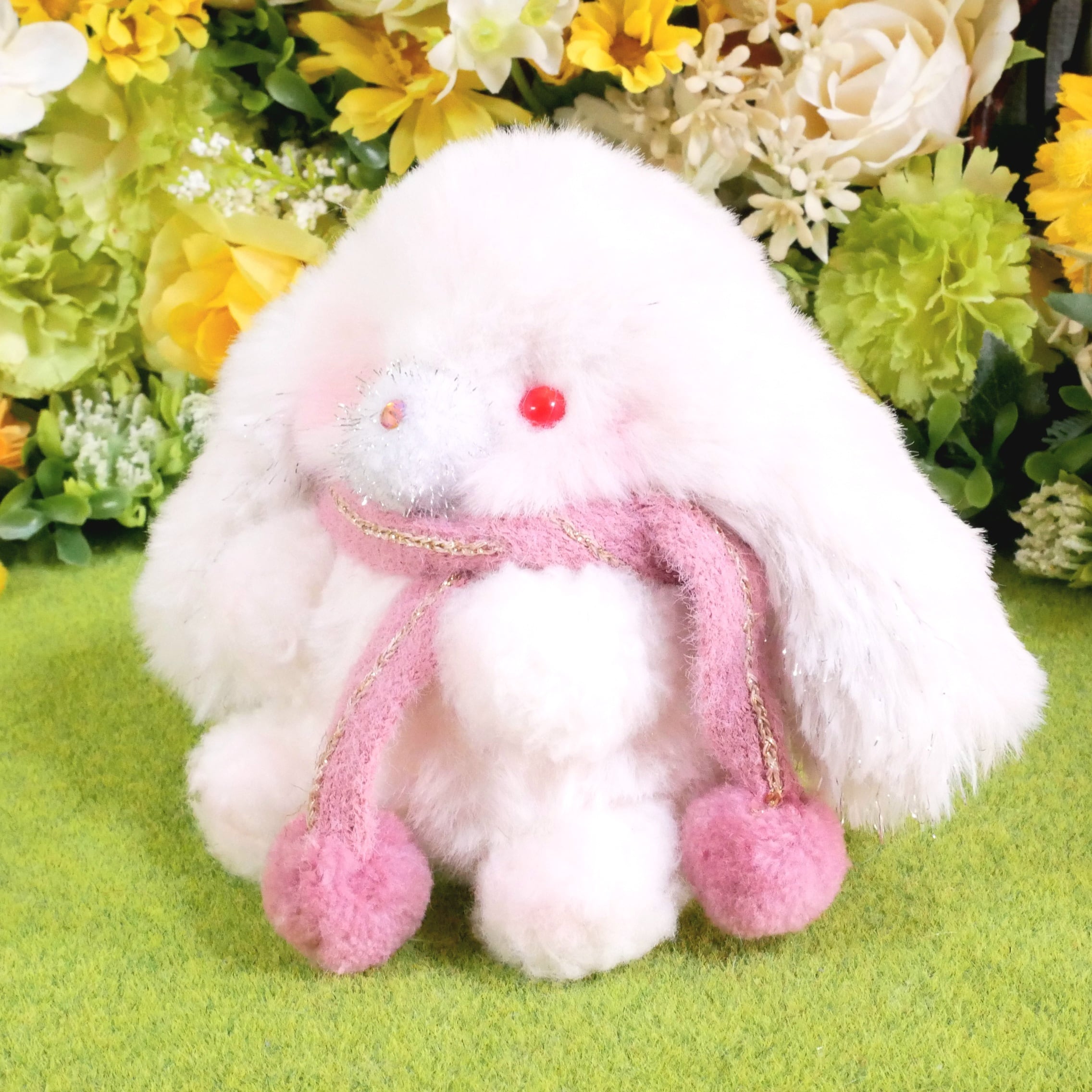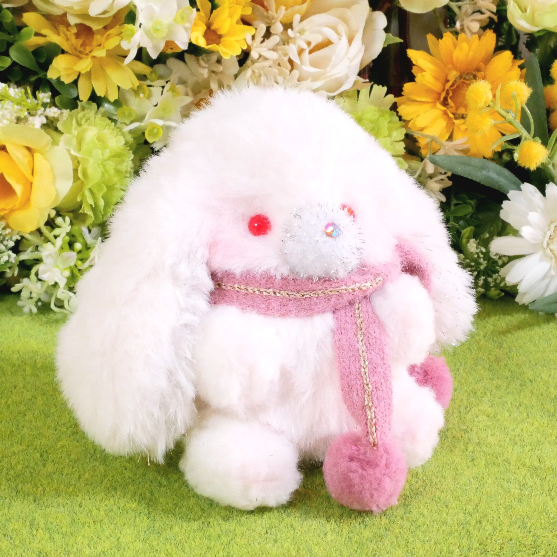 素材…ファー生地、ポンポンパーツ、ラインストーン、プラスチックアイ、綿、プラスチックペレット、リボン