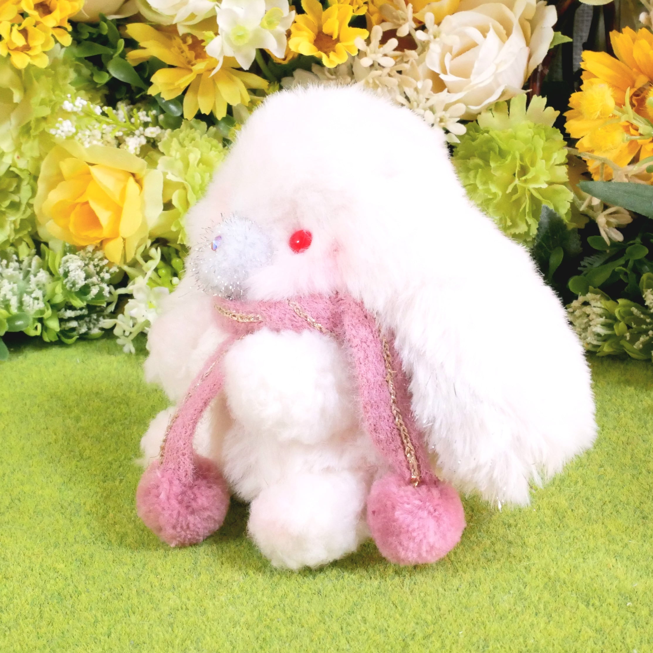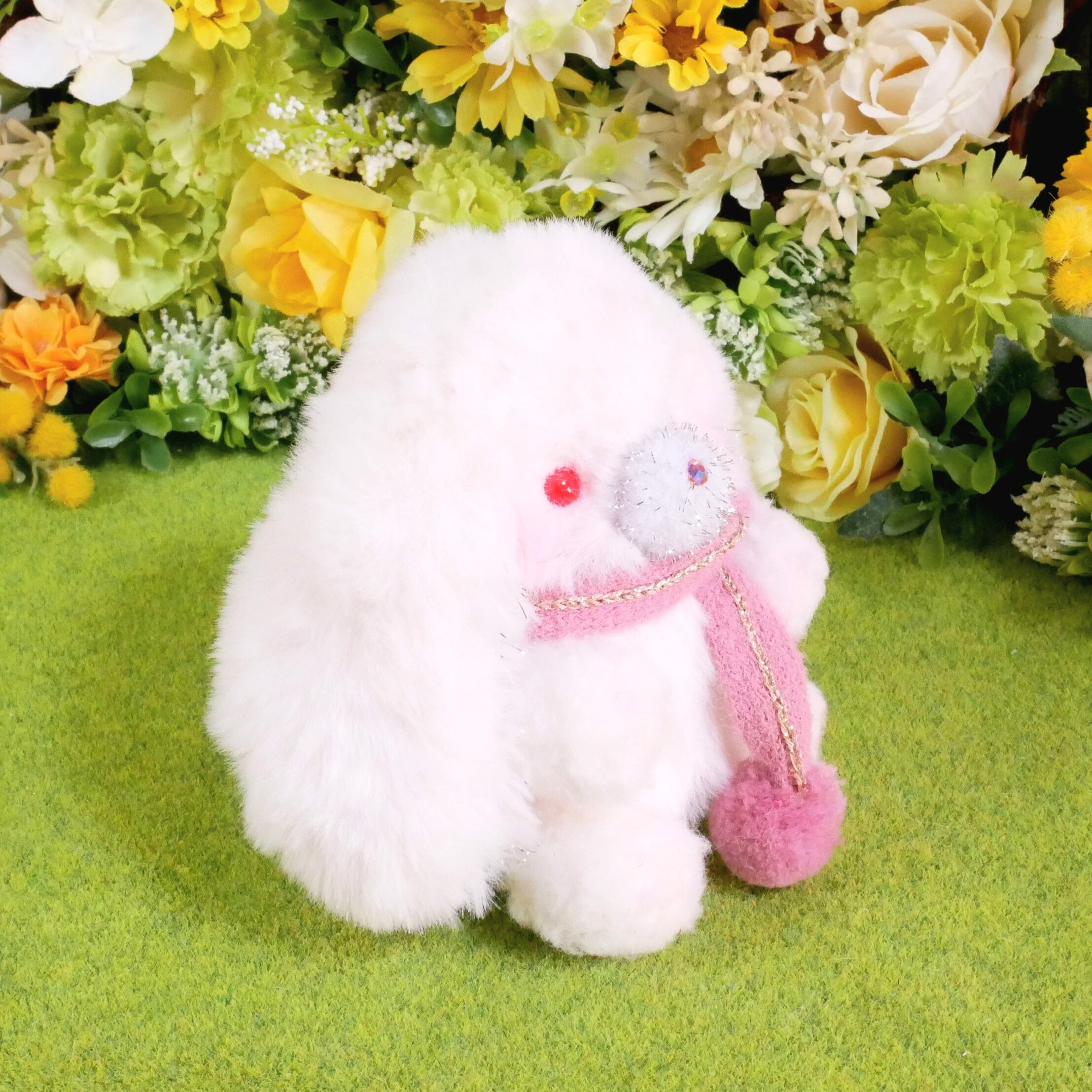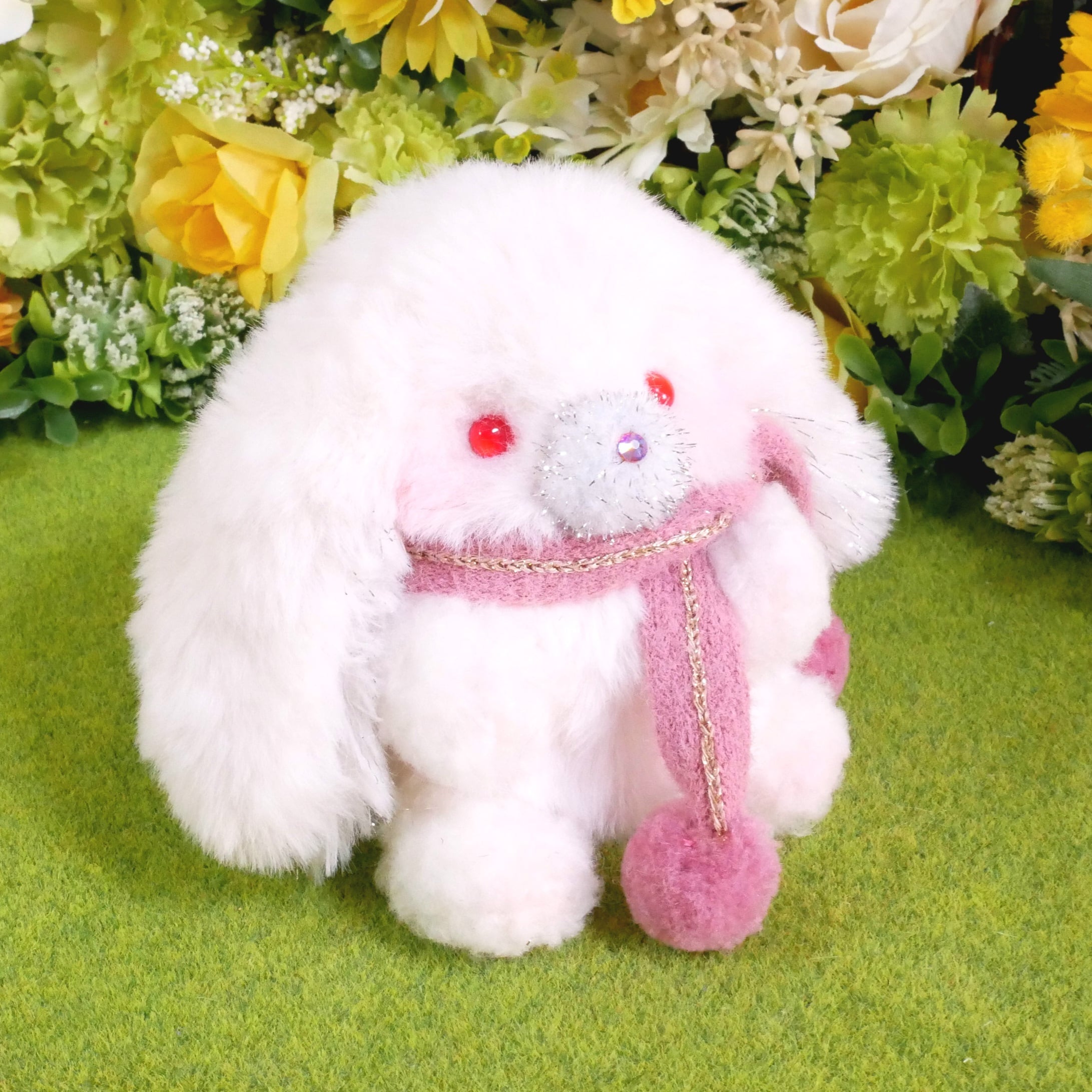 素材…ファー生地、ポンポンパーツ、ラインストーン、プラスチックアイ、綿、プラスチックペレット、リボン