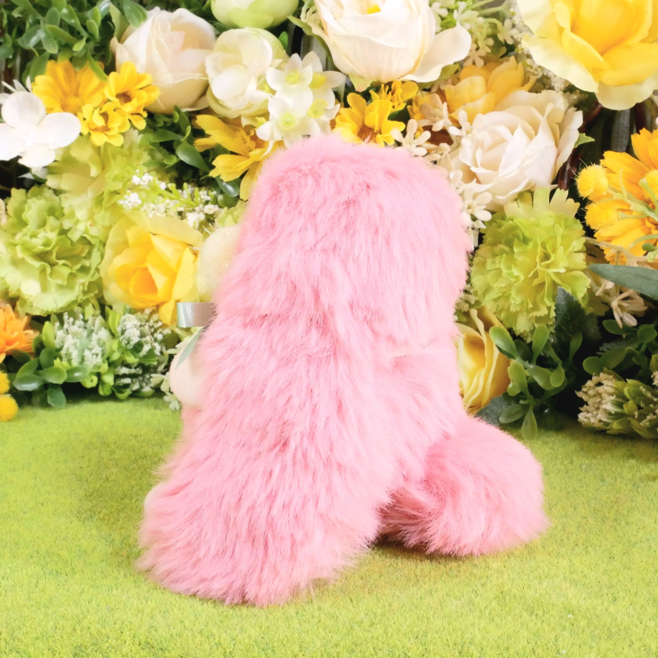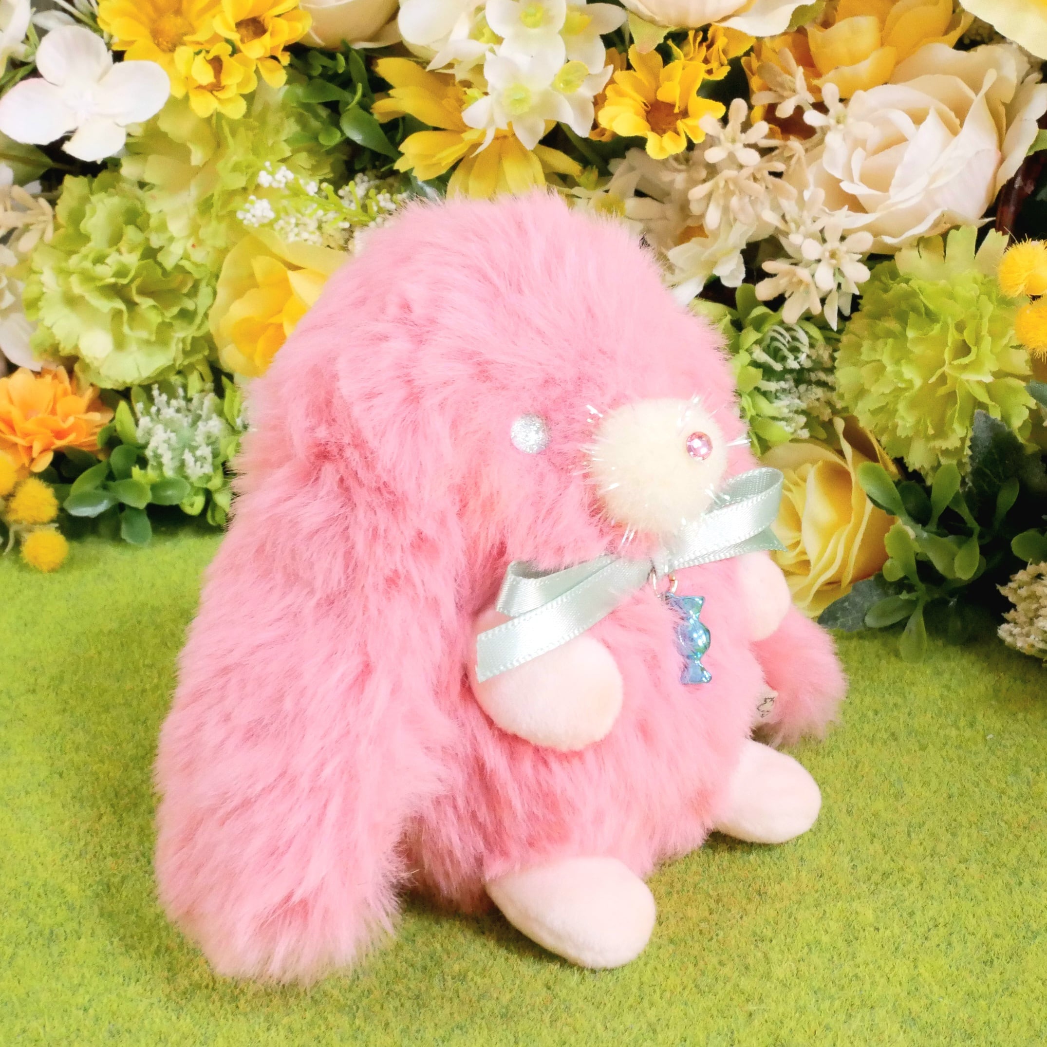 素材…ファー生地、ポンポンパーツ、ラインストーン、オリジナルグラスアイ、綿、プラスチックペレット、リボン、チャーム