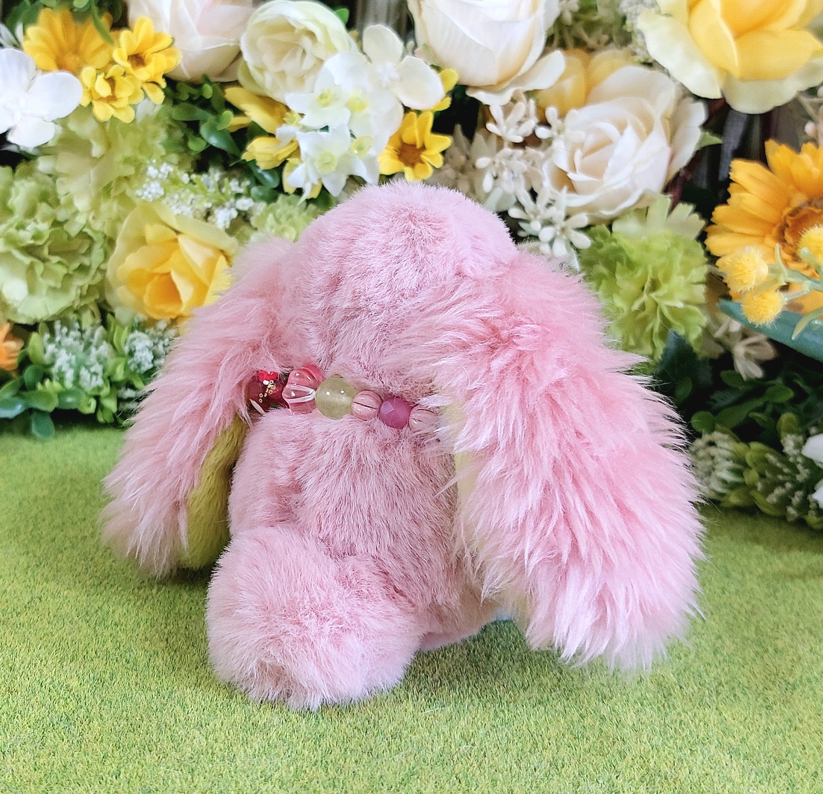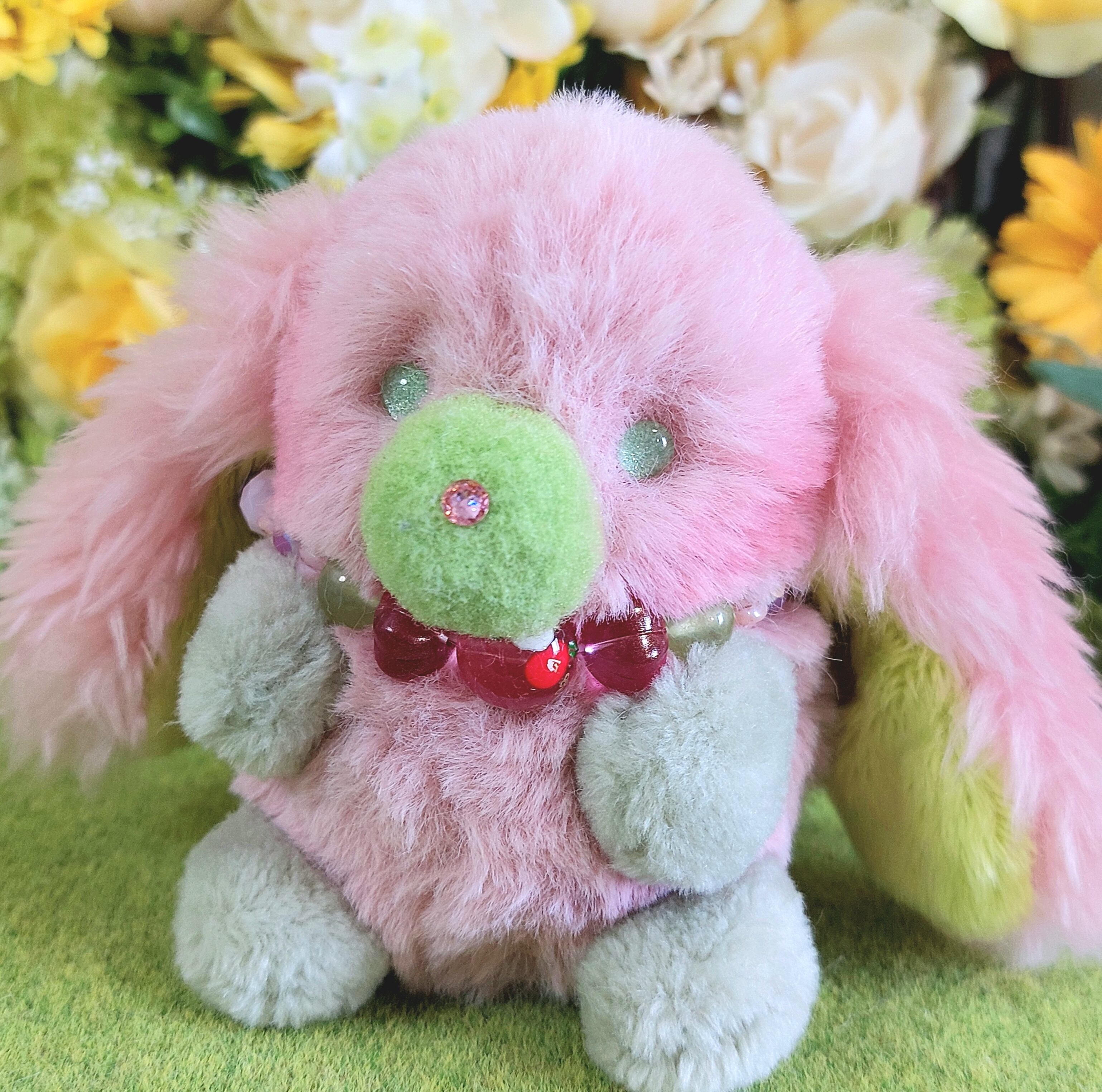 ボディは桜のようなピンク色の生地を使用、手足は抹茶カラーの生地を使用し、耳には毛足の長いふわふわなピンクの生地を使用しました。