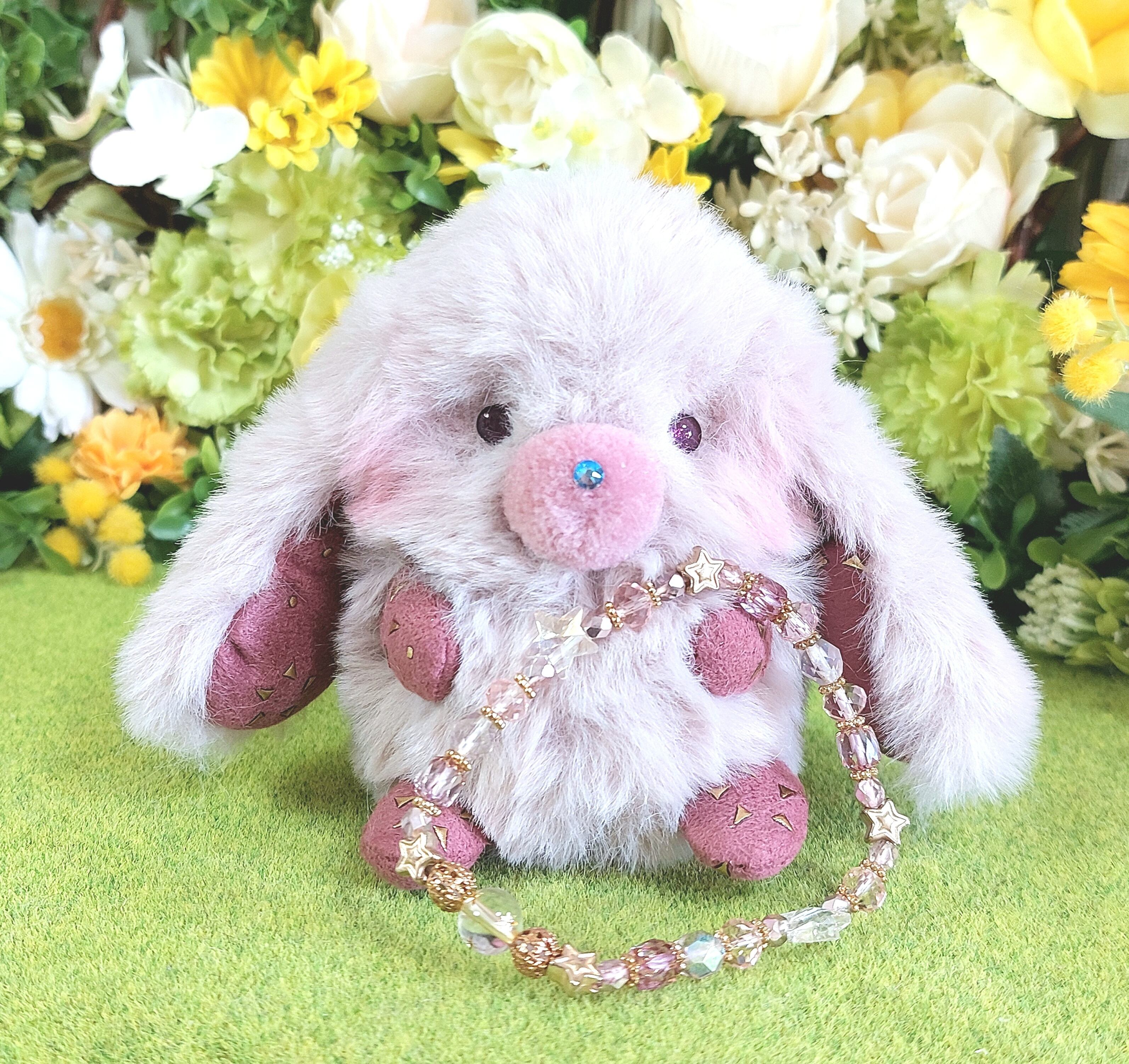 素材…ファー生地、ポンポンパーツ、ラインストーン、オリジナルグラスアイ、綿、プラスチックペレット